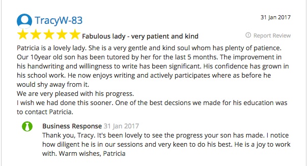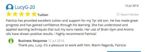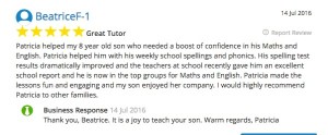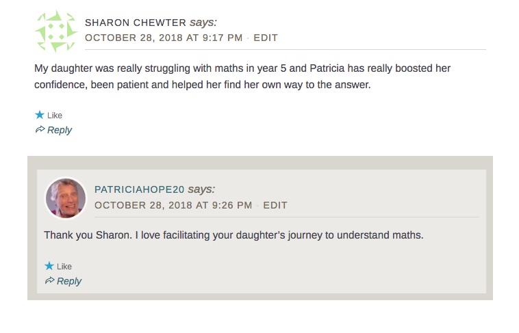 We are thrilled to have Patricia on board to help my daughter whose confidence was rock bottom but is steadily improving.