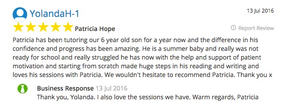 My little girl is making real progress at school and with her confidence thanks to Patricia’s tuition.