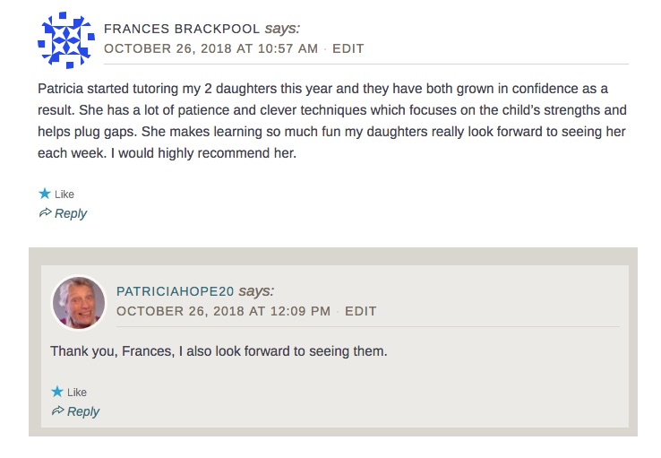 Patricia started tutoring my two daughters this year and they have both grown in confidence as a result.